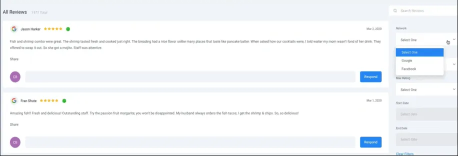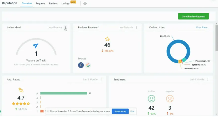 It allows you to view your reputation stats and send out review requests via email or SMS. When reviews come in, you can also click to respond if necessary.